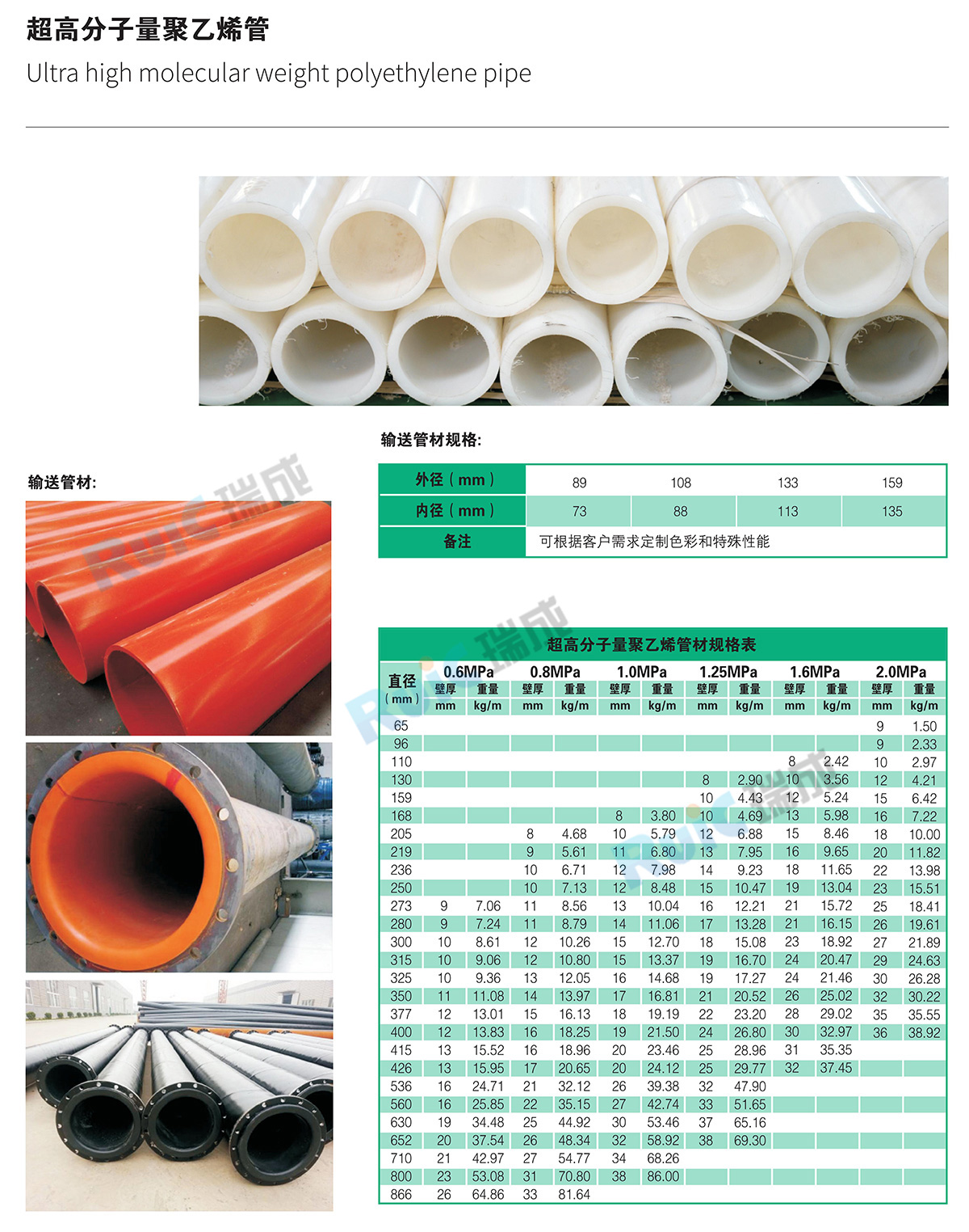 8、糧食輸送;衛(wèi)生無毒、高速輸送、不堵料、耐磨損、性價比高。超高分子量聚乙烯(UHMW-PE)管材規(guī)格及使用工作壓力可根據(jù)用戶要求制作。